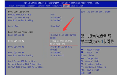 配置服务器的引导方式,服务器开机后,进入BIOS配置界面,在boot页面配置光盘引导和磁盘引导,一般第一项设为光盘,第二项设为磁盘,如下图所示。之后保存退出即可。