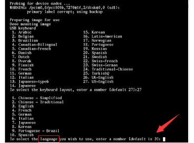 选择语言,默认是(3、英语),推荐英语,若选择中文,可选(1、简体中文)。