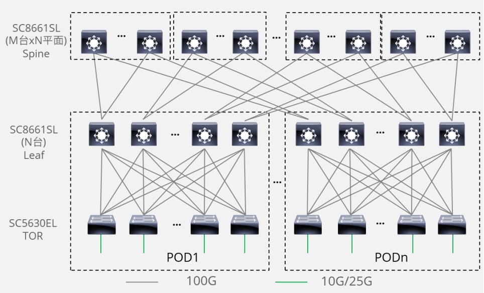 基于POD的Spine-Leaf组网架构,适合灵活的、弹性的网络部署,可以有效避免单点故障,降低对单点网络设备的依赖,可部署100K+服务器。