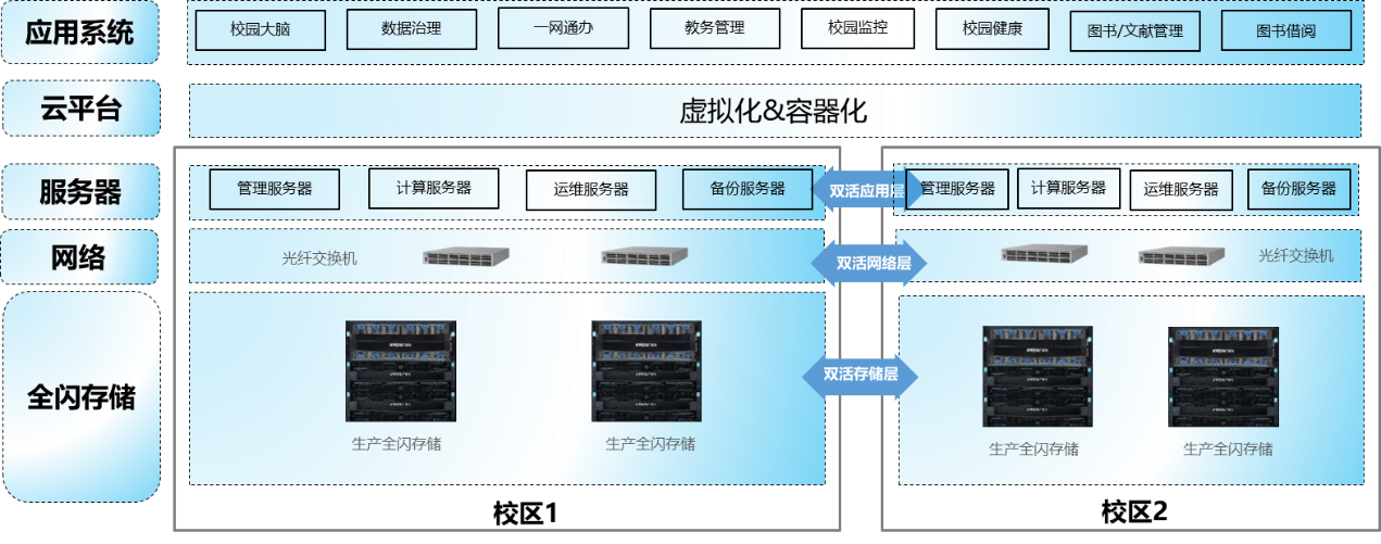 方案采用全闪存储支撑高校智慧校园云平台建设,采用FC组网,从性能、容量、可靠性和扩展性等方面为虚拟化平台及关键业务应用提供充足的存储支撑,满足业务应用对存储资源的多种需求,还可以利旧整合客户原有存储,将原有存储作为备份存储,最大化保护用户投资。因大部分学校为多校区格局,为提高业务系统连续性,在多校区之间部署双活存储建设方案,用其中一个校区做主中心,另一个校区做备中心,灵活应对数据中心级别的故障切换,提高业务系统连续性。